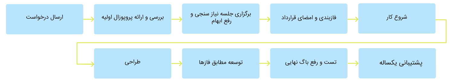 ما در رایانیتا، پس از بررسی اولیه درخواست، پروپوزال اجرایی خدمت شما ارسال میگردد. در صورت رضایت برای رفع ابهامات، شفاف سازی و نیاز سنجی دقیق جلسهای تشکیل میگردد. سپس در صورت درخواست همکاری قرارداد و فازبندی پروژه تنظیم و بین طرفین امضا میگردد. اکثر بندهای قرارداد توافقی بین طرفین است.